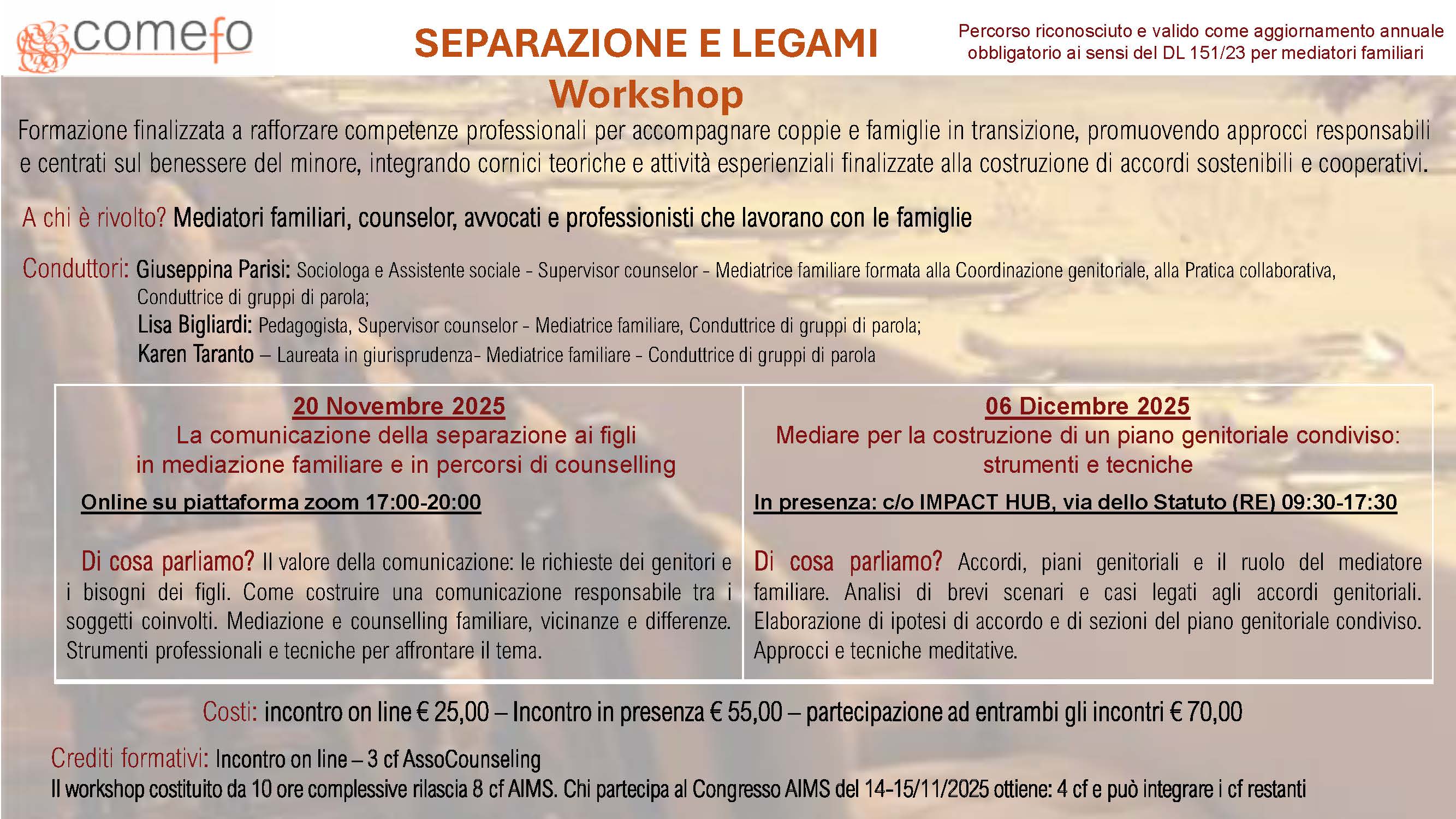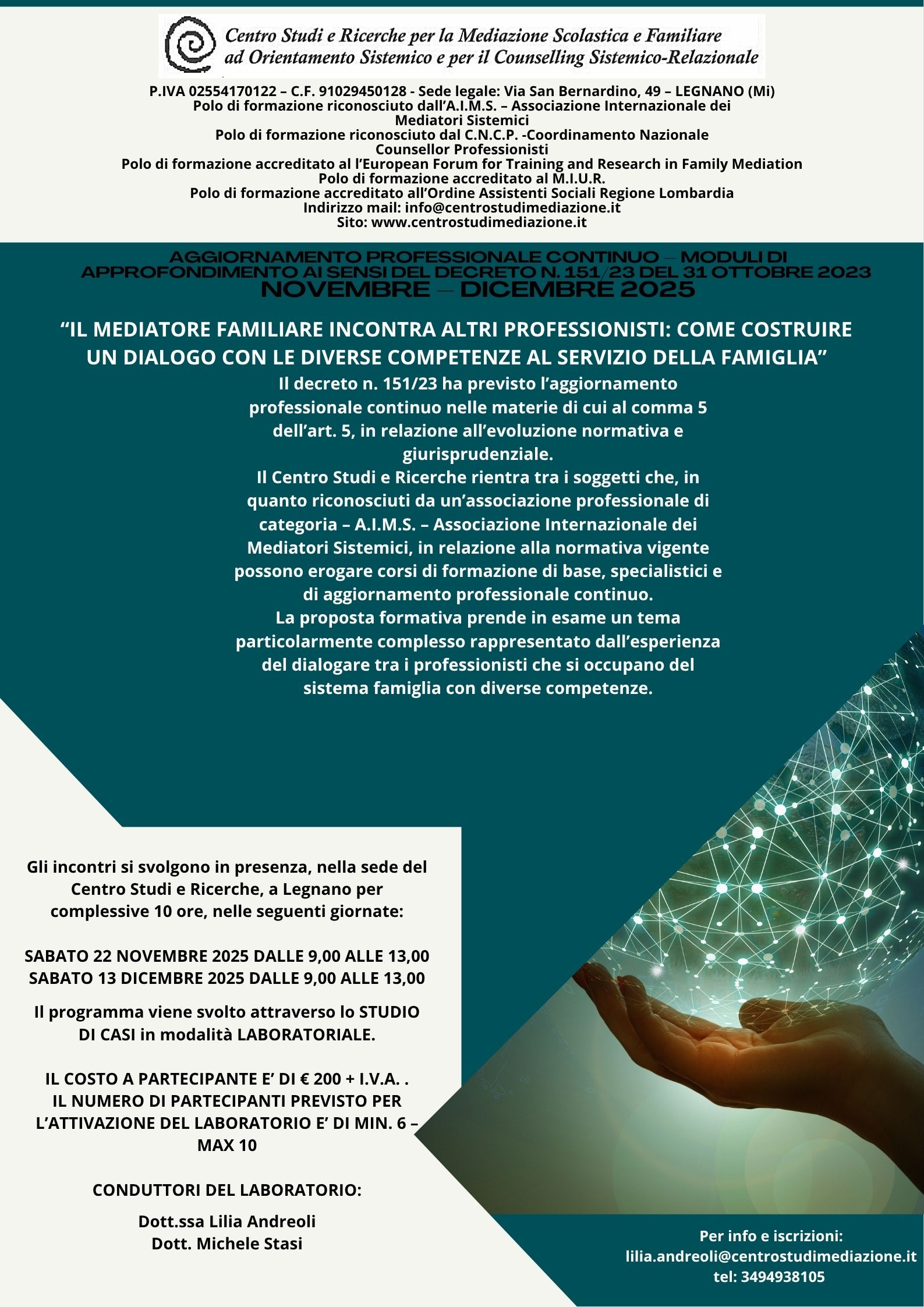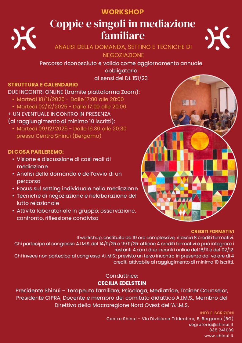 L’evento ha ottenuto 8 crediti formativi A.I.M.S. per la partecipazione all’intero percorso con prot. n. 74 ac. 151/ 2025 del 30/07/2025 Per info e iscrizioni: lilia.andreoli@centrostudimediazione.it tel: 3494938105