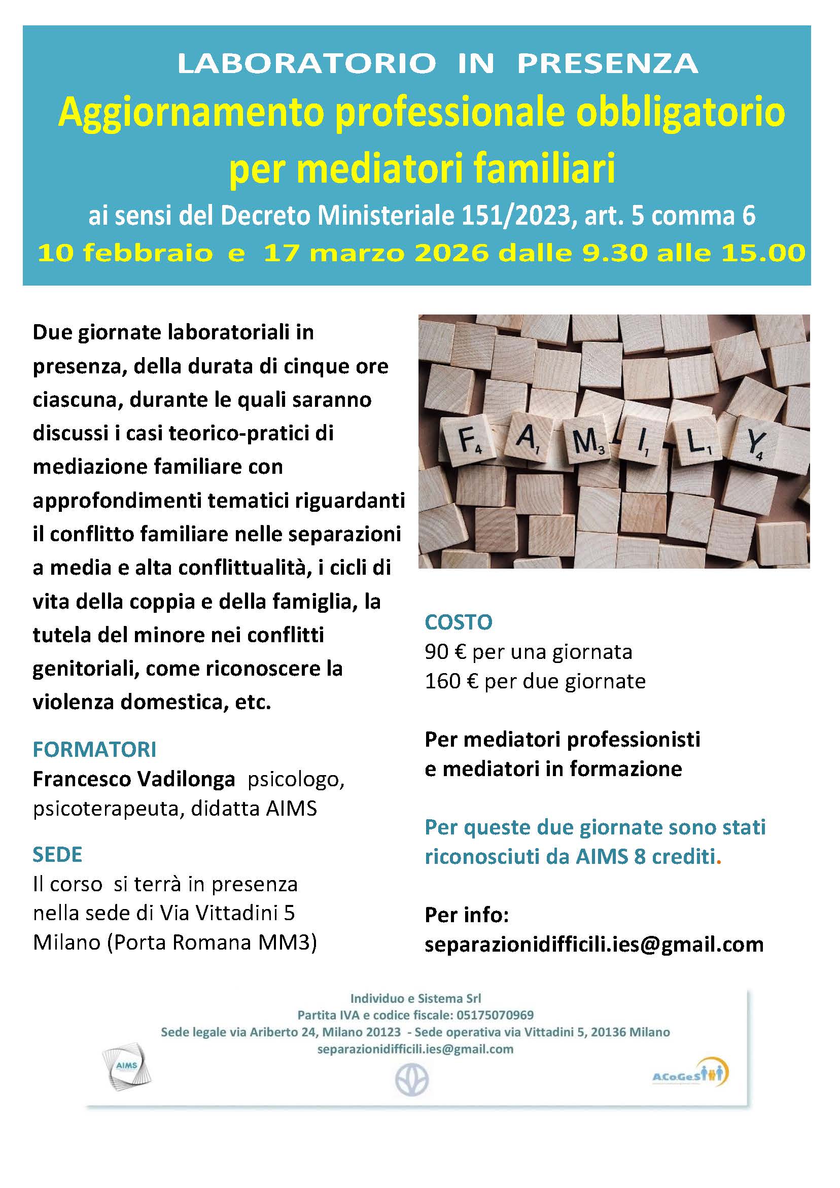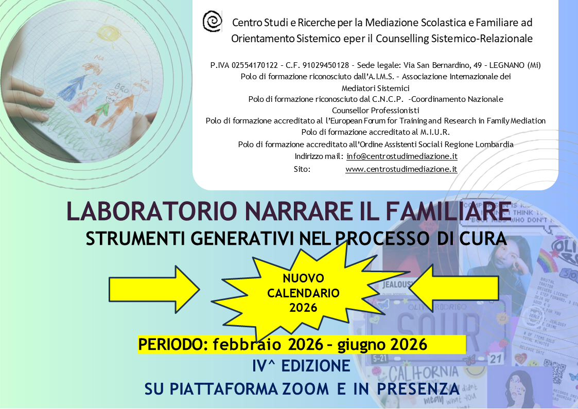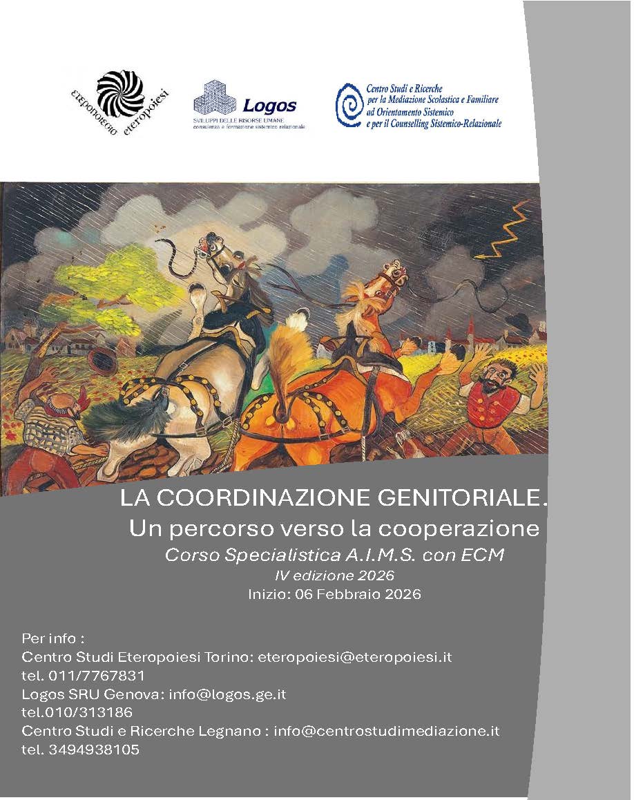 Corso Specialistica A.I.M.S. con ECM- IV edizione 2026- Inizio: 6 febbraio 2026 Per info: Centro Studi Eteropoiesi Torino: eteropoiesi@eteropoiesi.it tel. 011/7767831 Logos SRU Genova: info@logos.ge.it tel.010/313186 Centro Studi e Ricerche Legnano: info@centrostudimediazione.it tel. 3494938105