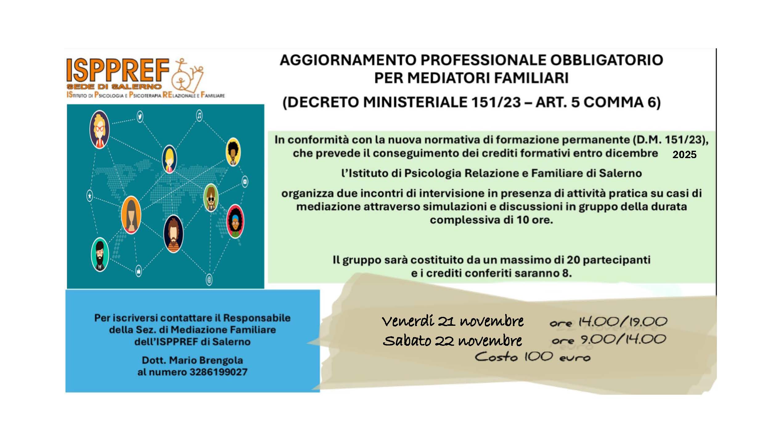 L’evento ha ottenuto 8 crediti formativi AIMS con prot. n 87 ac 151/2025 del 24/09/2025 per la partecipazione alle due giornate per info e iscrizioni: dott. Mario Brengola tel. 3286299027 https://www.isppref-salerno.it/