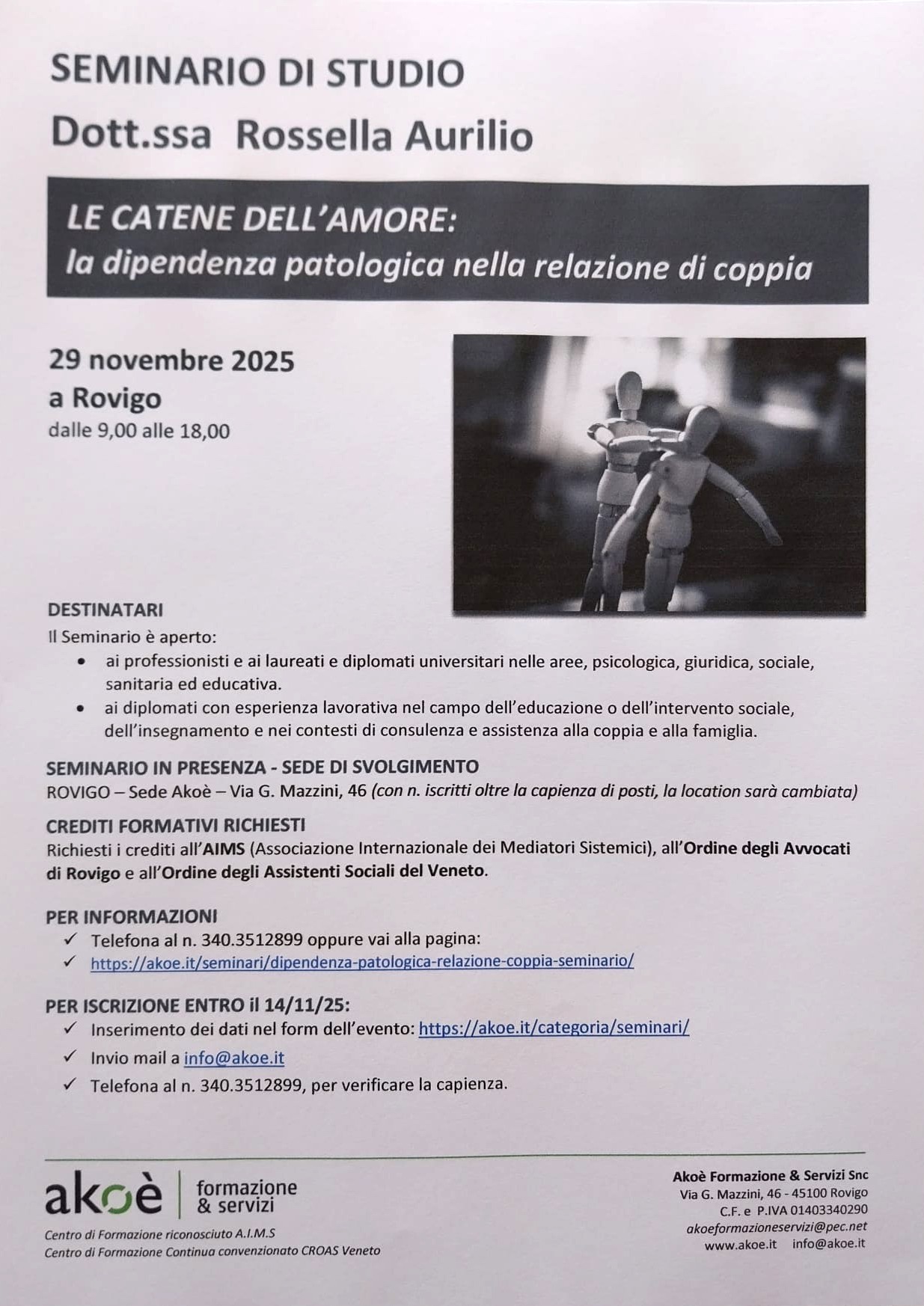 L'evento ha ottenuto ottenuto 6 crediti formativi AIMS con prot. n 91 ac 2025 del 13/10/2025 EVENTO IN PRESENZA presso la sede di Akoè: Rovigo Via G. Mazzini n.46 scheda di iscrizione: VEDI FORM ALLA PAGINA DELLA GIORNATA DI STUDIO, AL LINK INDICATO sotto