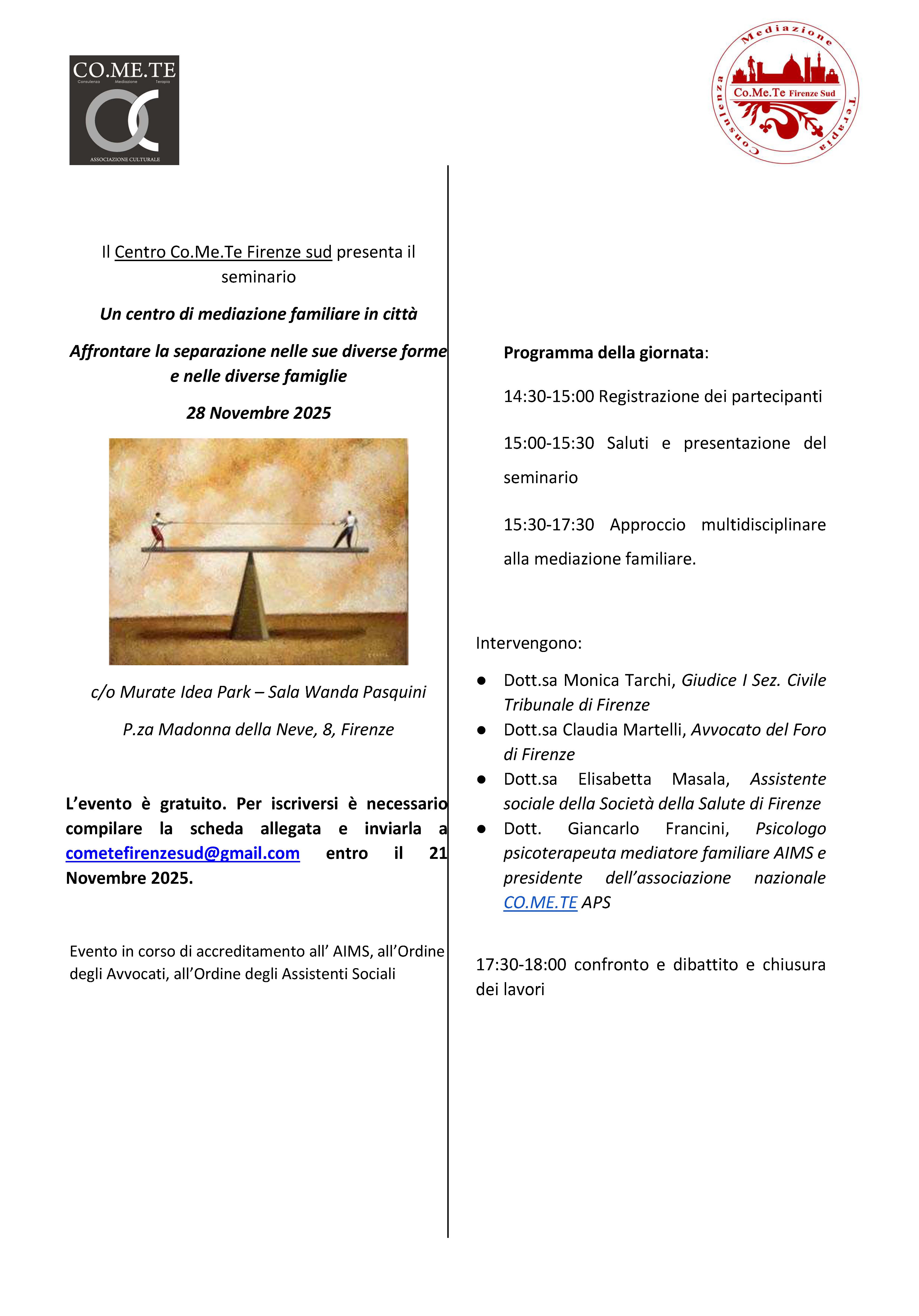 L’evento ha ottenuto 4 crediti formativi AIMS con prot. n 92 ac 2025 del 13/10/2025 La partecipazione è gratuita Link alla pagina del centro rispetto all’evento - www.cometefirenzesud.it Per info e iscrizione scrivere a cometefirenzesud@gmail.com