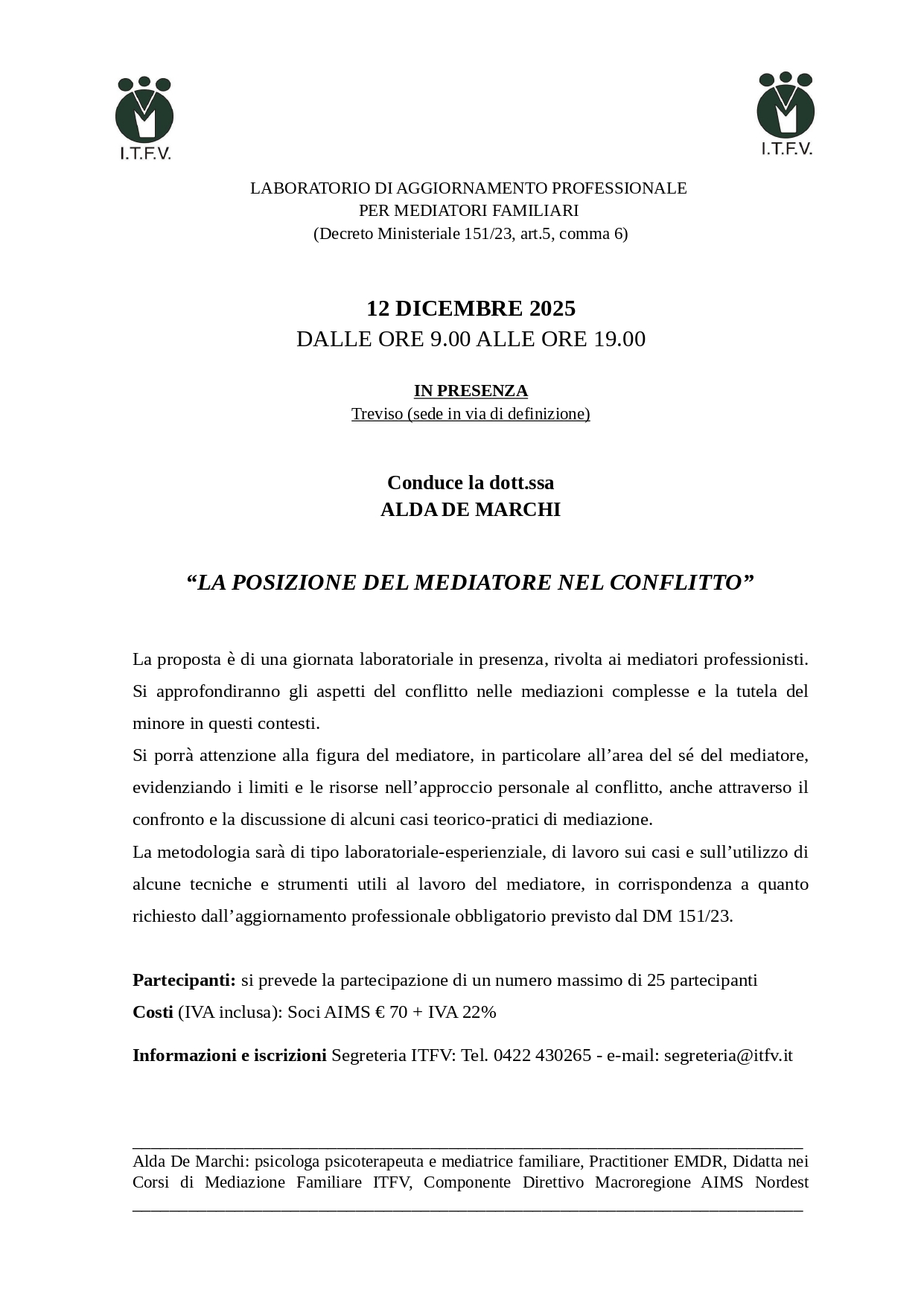 L'evento ha ottenuto 8 crediti formativi AIMS con prot. n 97 ac 151/2025 del 27/10/2025 Evento con frequenza in presenza a Treviso per info e iscrizioni: Segreteria ITFV: Tel. 0422 430265 - e-mail: segreteria@itfv.it