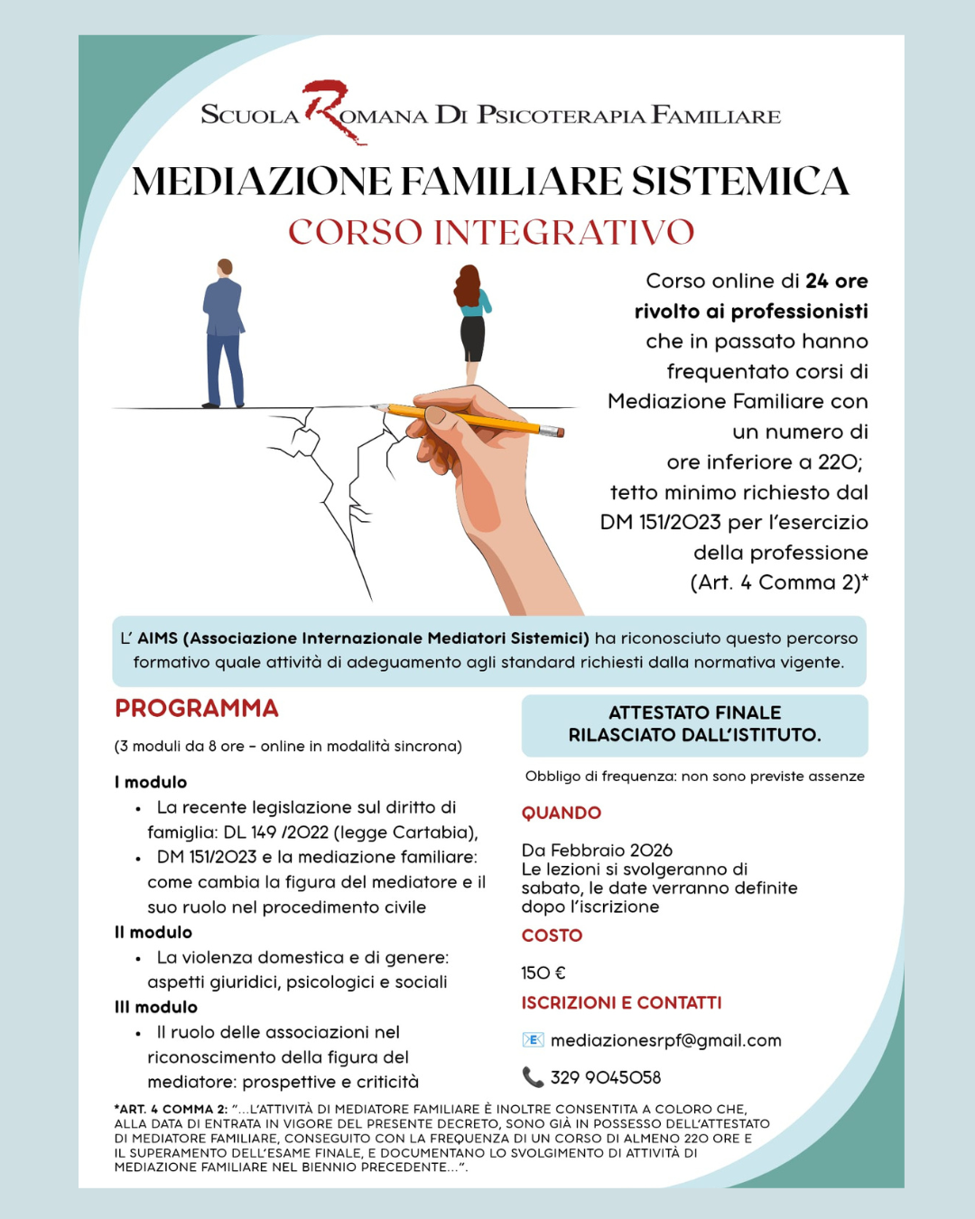 L’evento ha ottenuto 8 crediti formativi AIMS con prot. n 02 ac 151/2026 del 13/01/2026, pre la frequenza all'intero percorso. Per info: separazionidifficili.ies@gmail.com