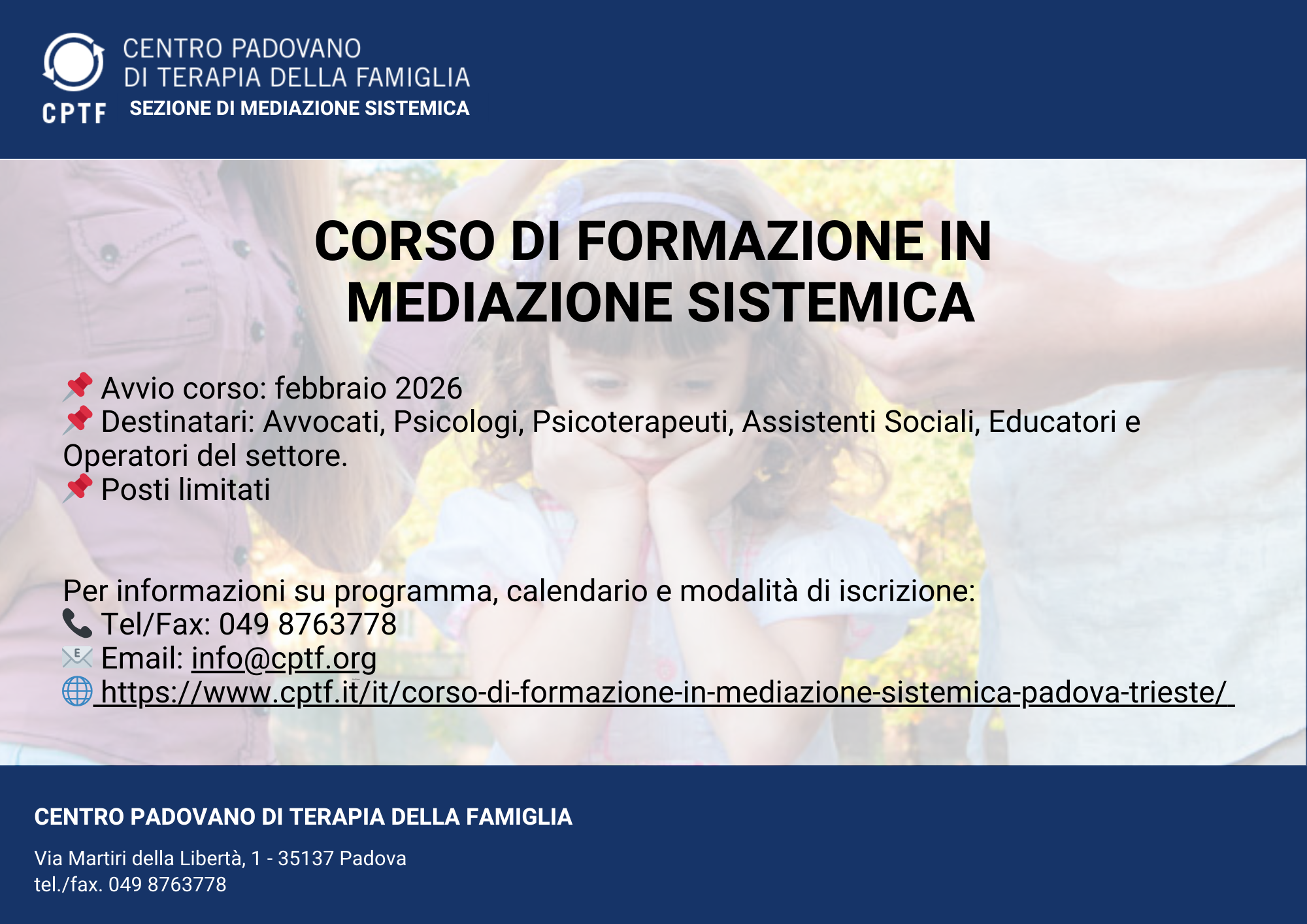 Per informazioni su programma, calendario e modalità di iscrizione: tel 049 8763778 info@cptf.org https://www.cptf.it/it/corso-di-formazione-in-mediazione-sistemica-padova-trieste/ Corso di Formazione in Mediazione Sistemica 2026 Per permettervi di conoscere l'approccio didattico e i docenti, vi invitiamo a partecipare a un incontro f...